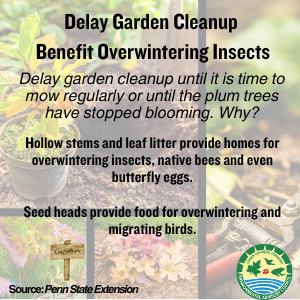 - Save garden cleanup for the spring- many pollinators overwinter in hollow stems, attached to plants or in leaf litter.