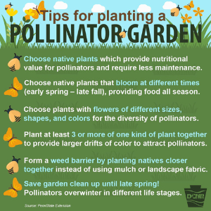 Why are pollinators important? Without them many fruits and vegetables would not be able to grow, so our whole food chain would eventually collapse. Planting pollinator friendly plants, especially native ones, ensures that these bees, butterflies, bugs, wasps, and other insects have the nectar and pollen they eat to survive, so that we in turn will survive. Here are some tips for planting your own pollinator garden:
