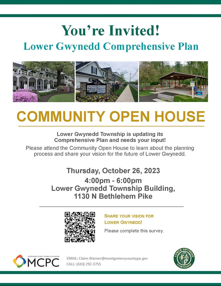 Lower Gwynedd Township is in the process of drafting a new comprehensive plan, and we want to hear from you! The plan will provide a vision for the future of the township and a framework for the management of development in Lower Gwynedd over the next 20 years. Your opinion is important to help us understand the issues that are most important to you both in your neighborhood and on a township-wide scale. If you live, work, shop, or otherwise spend time in Lower Gwynedd, we invite you to complete the community survey, and let us know your thoughts! Please share this survey with your friends and neighbors and please join us for an open house on October 26! Links to the survey and information on the open house are included below!