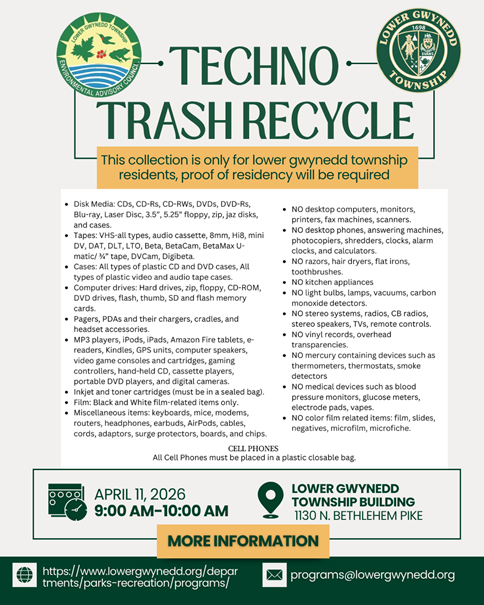 📍 Lower Gwynedd Township BuildingSafely dispose of your unwanted electronics at our Techno Trash Recycling event. This service is available to Lower Gwynedd Township residents ONLY (proof of residency required).
