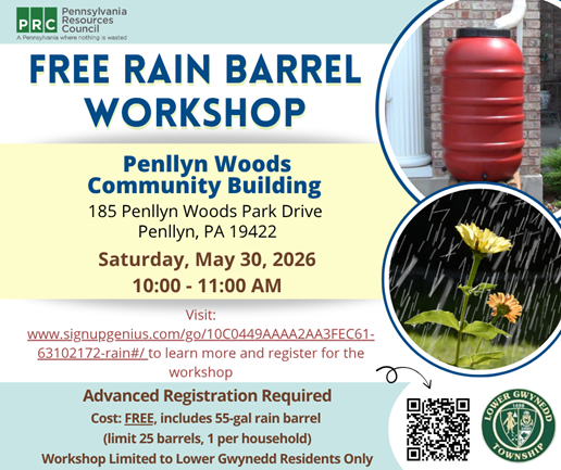 📍 185 Penllyn Woods Park Drive, Penllyn, PA 19422Join us for a free rain barrel workshop! Learn how to conserve water and reduce runoff while taking home your own rain barrel.