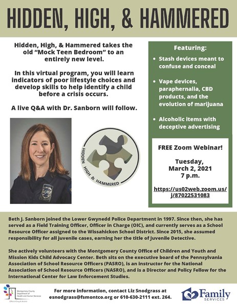 Family Services of Montgomery County will host a free webinar on March 2 featuring Lower Gwynedd Police Officer Beth J. Sanborn discussing indicators of poor lifestyles choices by children and helpful skills to identify a crisis before it occurs.