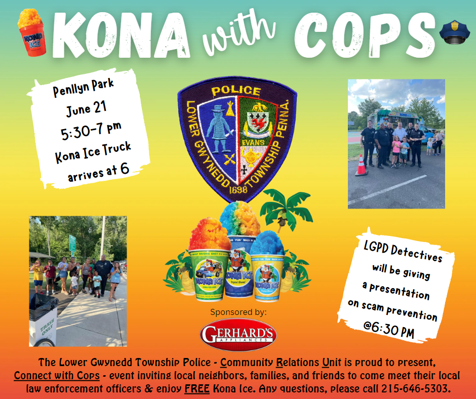 Join the Community Response Unit for some Kona ice! The community is invited to come out and meet your local law enforcement officers and enjoy a free Kona ice on Wednesday, June 21st from 5:30-7:00 pm at Penllyn Park. The Kona truck arrives at 6pm and the LGPD Detectives will be giving a presentation on scam prevention at 6:30pm.