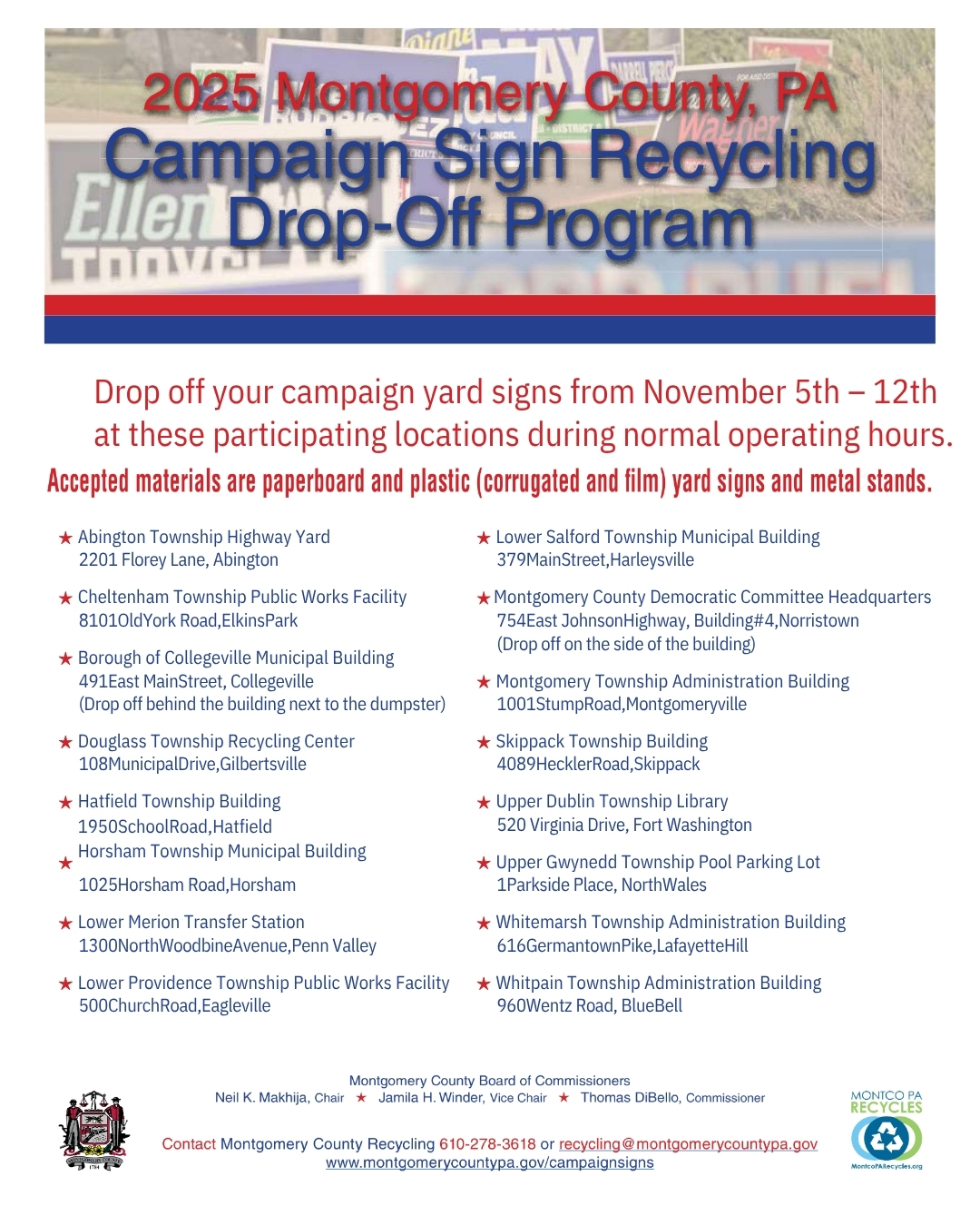 Montgomery County will again run their annual campaign sign recycling program. There are 16 drop off sites around the County and signs can be dropped off for one week after Election Day. For more information visit Montgomery County Recycling Information and Collection Events page.